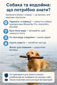 - Комплексні препарати: Зверніть увагу на засоби, які захищають від кліщів, бліх та внутрішніх паразитів, включаючи дирофіляріоз (серцеві черви). Це особливо актуально, адже дирофілярії переносяться комарами, що активно розмножуються біля водойм.